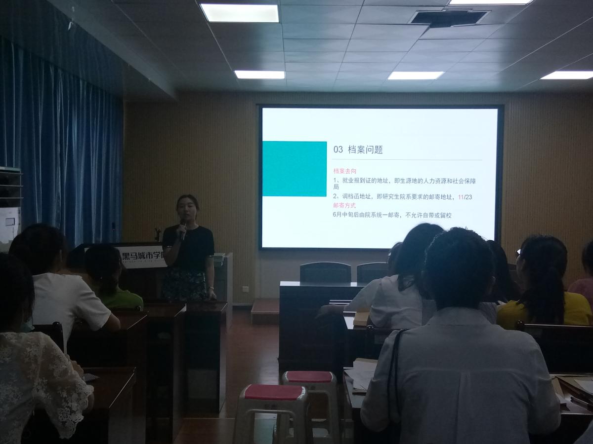 辅导员闫冬就离校前的各项事务性工作和注意事项做了详细阐述,就学位学分申请、校园贷款还款、档案去向、报到证办理、党员的组织关系转接、文明离校及离校后的通讯录等问题为学生们上了毕业前的“最后一课”。接着,向学生们发出了文明离校倡议,望大家心怀感恩之心,为母校“做一件好事,献一片真情”,用实际行动为大学生活划上一个完美的句号。