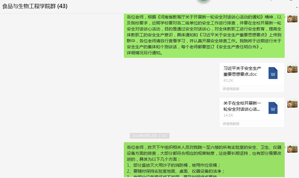 按照学校要求,结合我院实际情况,食品学院在全体教职工中开展安全对话谈心活动,并在实际工作中抓好贯彻落实。学校下发相关通知后,我院通过周五例会向全体教职工传达了通知精神,党总支书记刘学功和老师们进行了集体谈话,向老师们解读了习近平关于安全生产重要思想要点,要求全体教师:一要积极弘扬生命至上、安全第一的思想;二要学习贯彻相关法律法规和学校安全管理制度;三要举一反三、警钟长鸣,积极采取有效措施加强安全工作,有效防范和遏制重特大事故发生。