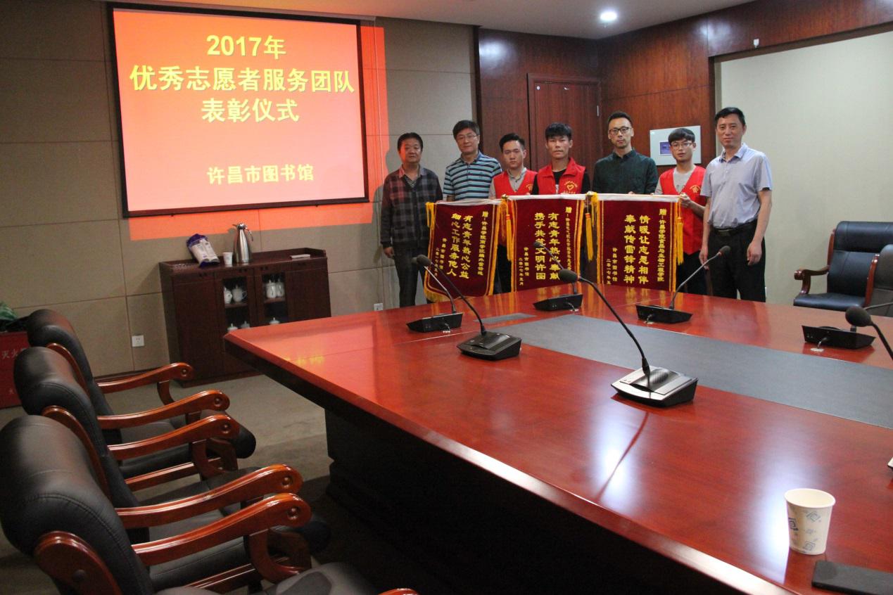 6月5日上午,许昌市图书馆举行2017年优秀志愿者服务团队表彰仪式,许昌市图书馆馆长安玉龙,副馆长吴国强出席表彰仪式,我校商学院郭少辉老师,编外雷锋连副连长郭志强,食品与生物工程学院团总支书记陈荣华老师,编外雷锋连副连长、学生会主席郭显锋参加此次表彰仪式。