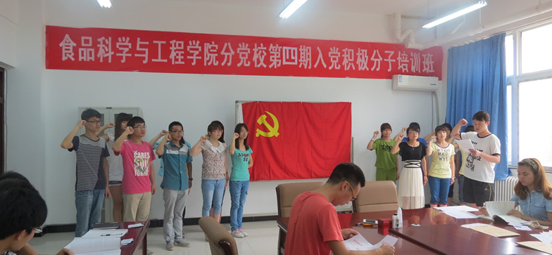 大会共分为三个部分,首先陈荣华老师宣读了校党组通[2013]9号和33号两份文件,宣布了经过校党委的审查并批复了我院上次申报的贾茗方等14名同志发展为预备党员和李雪乐等6名预备党员转正的情况。党支部组织委员牛栋栋带领贾茗方等14名新发展的预备党员在党旗下郑重宣誓。