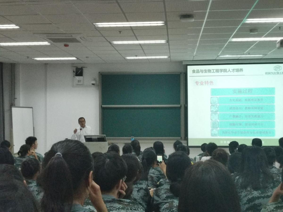 王德国院长首先对全体新同学到食品与生物工程学院学习表示热烈欢迎,并希望新生同学们能尽快适应大学的学习和生活,尽快地做好职业生涯规划,踏实学习,勇于钻研,努力创新。王院长用亦师亦友的口吻,为同学们讲述了我院成立至今的发展历程以及食品专业的相关知识与发展前景,同学们反应热烈,现场气氛十分活跃。院长通过与同学们互动的方式讨论分析食品专业的就业优势,通过这种方式让同学们对自己所选择的专业有了更深的了解。随后,王院长对目前我院强大的师资团队、一流的科研平台做了详细的介绍,使同学们对自己将要学习的专业和大学生活有了进一步的认识。王院长最后强调,大学生活中要努力提升所选专业的知识水平,勇于开拓才能找到成功路。同学们一定要珍惜大学生活,充分利用学校提供的资源和条件,养成自主学习的习惯;锻炼自身能力,感悟大学精神,认识自我和成才途径,尽快融入大学校园生活。
