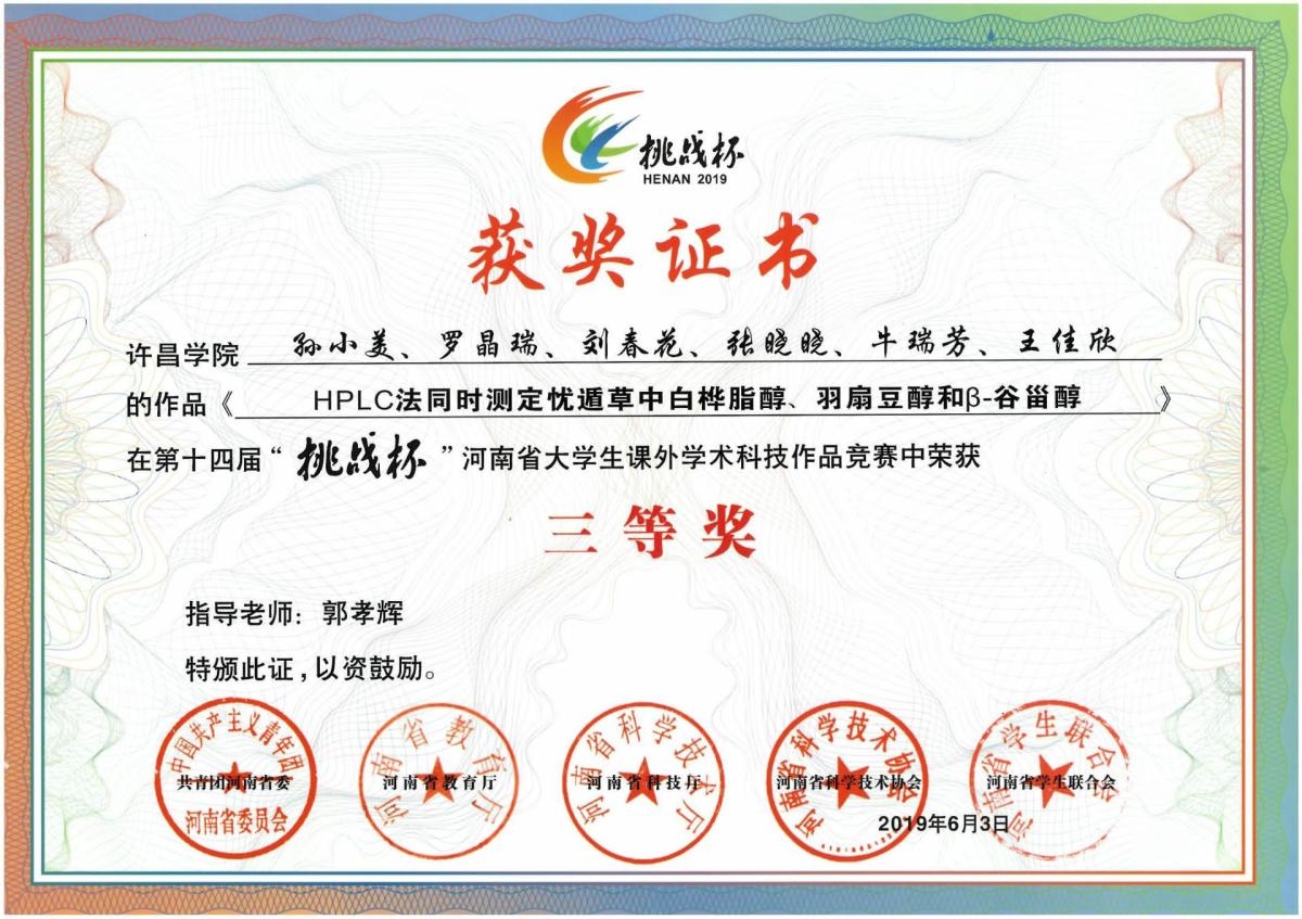 经过项目展示、终审答辩、评委评审等环节,我院由孙军涛、魏泉增老师指导,邵志杰等同学的作品《香肠中亚硝酸替代品的研究》荣获第十四届“挑战杯”学术科技作品竞赛中二等奖;由王德国院长、陈晨老师指导,龚兰玉等同学的作品《试剂盒-快速检测真假蜂蜜》与郭孝辉老师指导,孙小美等同学的作品《HPLC法同时测定忧遁草中白桦脂醇、羽扇豆醇和ß-谷甾醇》在本次大赛中同时荣获三等奖。