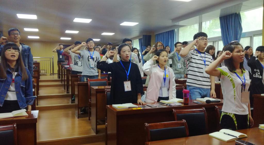 团总支书记陈荣华老师带领全体成员重温入团誓词:“我志愿加入中国共产主义青年团,坚决拥护中国共产党的领导……”。熟悉的誓词唤起了团学干部的团员意识,进一步加强了我院团组织的向心力与战斗力。