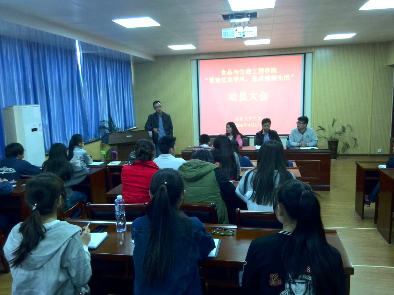 4月1日中午,我院在食品院学术报告厅举行了“打造优良学风,追求健康生活”的动员大会暨团总支学生会第二次全体例会。团总支书记陈荣华出席了本次会议并详细介绍了“三个深入”的具体内容。