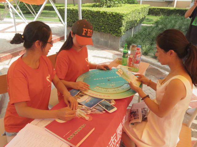 烈日当空,酷热难耐,但在小区咨询台前却是一番热闹非常的场景。健康体质转盘、控油壶、腰围尺、精心印制的宣传页等简单的小道具热情吸引了社区居民前来咨询。实践队员们则主动与居民拉家常,在面对面交流互动中了解他们的日常饮食习惯,并帮助他们完成事先准备好的膳食营养调查问卷,从而以进一步了解他们的膳食营养结构。在与居民接触的过程中,实践队员们还利用所掌握的专业知识,针对健康饮食和一些常见夏季疾病的预防进行宣传。而几个常见的饮料瓶也大有文章,队员们针对饮料瓶瓶底的可回收利用的数字符号所代表含义进行了宣讲。