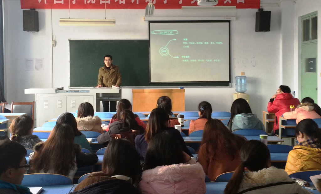 本次班会以“2013年终工作总结暨2014年度学期计划”为主题展开,首先由全体班委和学生党员对2013年的个人工作进行了述职,对评选出的优秀宿舍长和班级活动积极分子进行表彰,优秀宿舍长代表侯锋彩,积极分子代表景宗会也先后发了言。