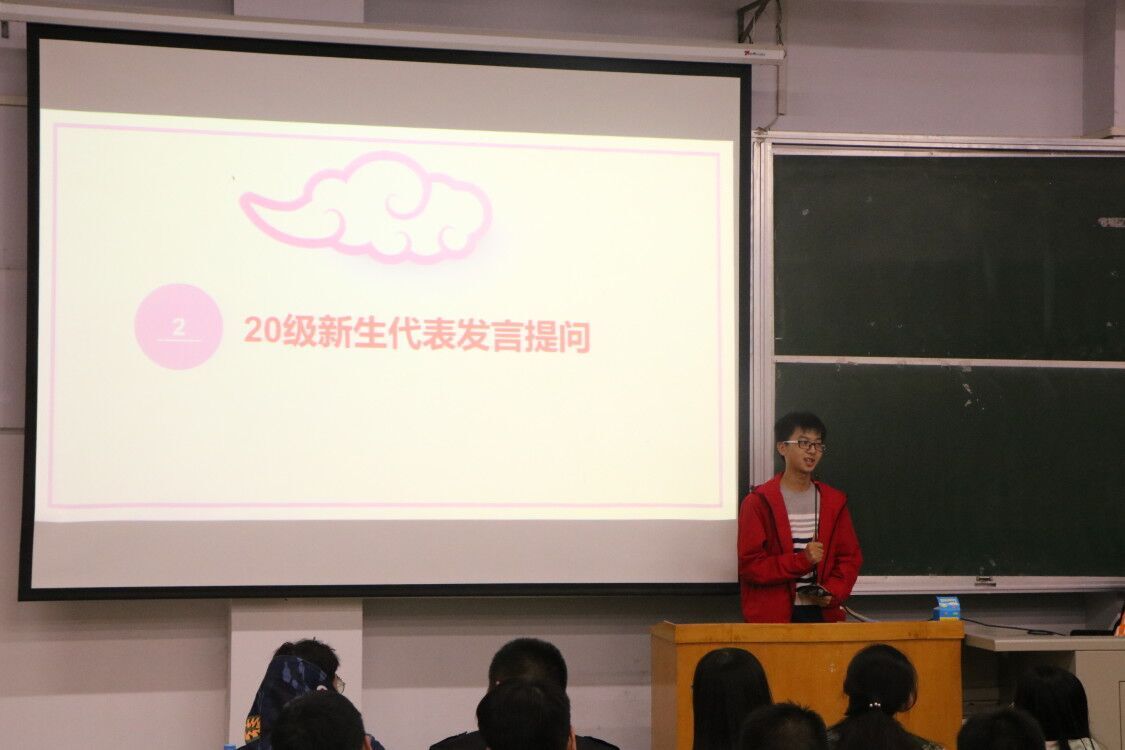 嘉宾讲解完毕,先由20级学委代表发言提问,再由新生自由提问。嘉宾积极回答并解决新生的问题,让新生们对以后的大学路有了更清楚的认识。交流会接近尾声时,由学习实践部播放19级同学的祝福视频,新生认真观看感悟良多。视频结束,全场同学激情澎湃,教师中响起了热烈的掌声。
