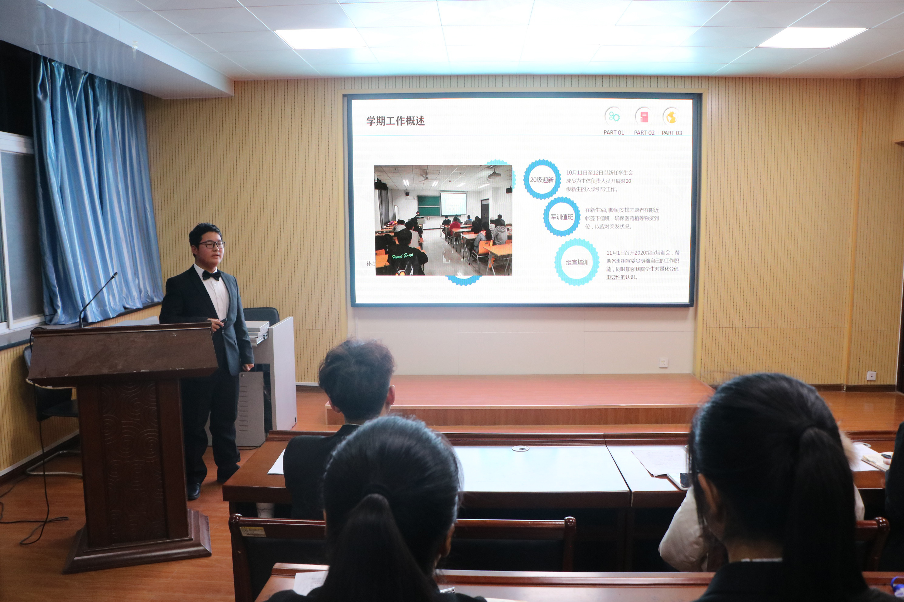 会议开始,全体成员起立奏唱国歌并进行合照留念。随后,20级辅导员王曼琪向为学院发展付出努力的学生工作者表示感谢,对其工作成果表示肯定,并为团委宣传部、组织部以及学生会未来的发展提出了“学习工作一起抓”、“既不耽误学习,也要按时完成工作”的建议。接着,各部门负责人以PPT展示的形式对本部门这一学期工作情况进行概述,总结工作上的得失,并结合自身部门特点,向在场成员传授了宝贵经验。随着部门总结的完成,部分干事对自己本学期的工作进行总结,其中学习实践部干事李玲讲述了自己从面试到工作期间经历的困难以及收获,并对帮助过自己的学长学姐表达了感谢。
