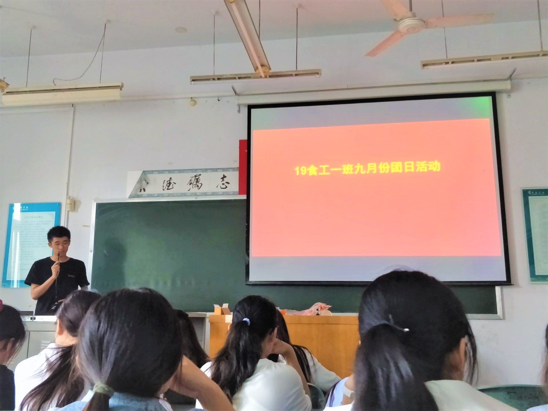 为更好的使支部成员了解社会主义核心价值观的深层含义和如何更好的学习运用社会主义核心价值观,做到与祖国共奋进,9月25日,我院19食安一班团支部在B3-103举办本月的团日活动。在团歌中,同学们回忆入团激情,随后,班长介绍活动背景,团支书组织支部成员观看相关视频,成员之间进行互动,最后组宣委对活动进行了总结。此次活动,不仅加强了班级体的凝聚力,还激发了食安一班支部成员的积极性。