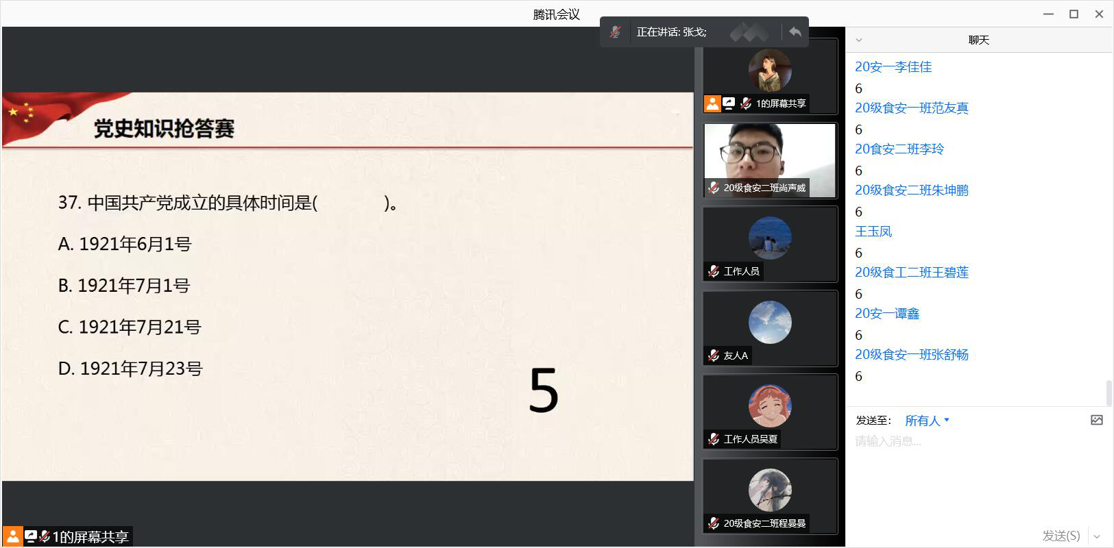为深入学习贯彻习近平总书记在庆祝中国共产党成立100周年大会上的讲话精神,持续深化“学党史、强信念、跟党走”学习教育,使同学们能更好的学习党史知识,10月4日晚8点,我院举办了线上党史知识抢答赛,本次比赛由宣传部负责人张戈主持。