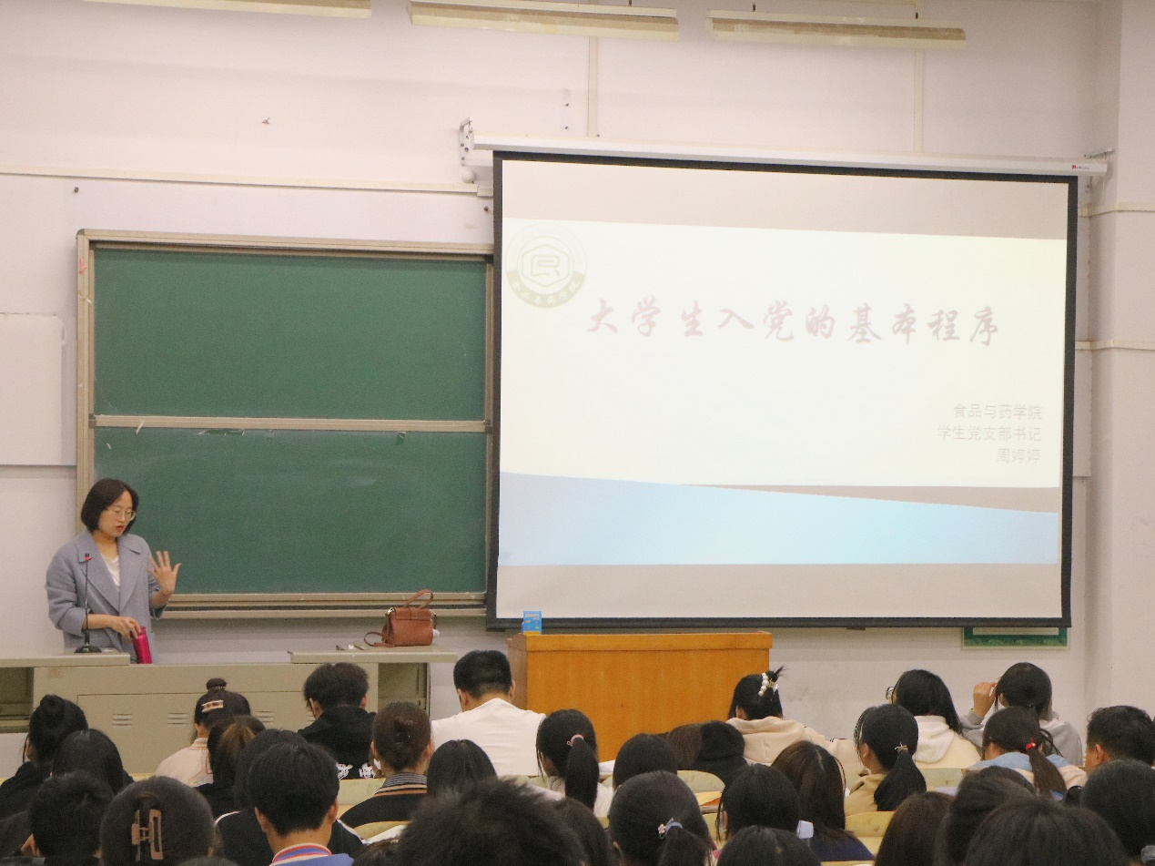 院学生党支部书记周婷婷向同学们讲解了申请入党的基本条件、大学生党员的具体条件以及发展党员的工作流程,同时她强调了入党的严格要求,建议同学们全面综合发展、把握好入党时机。她告诫同学们一定要分清主次,抓好学习,合理安排时间。讲座最后,21级食安一班班长张英豪向同学们播放有关大学生网贷、信用卡诈骗等方面的短片,提醒大家要加强防范网络诈骗的意识。