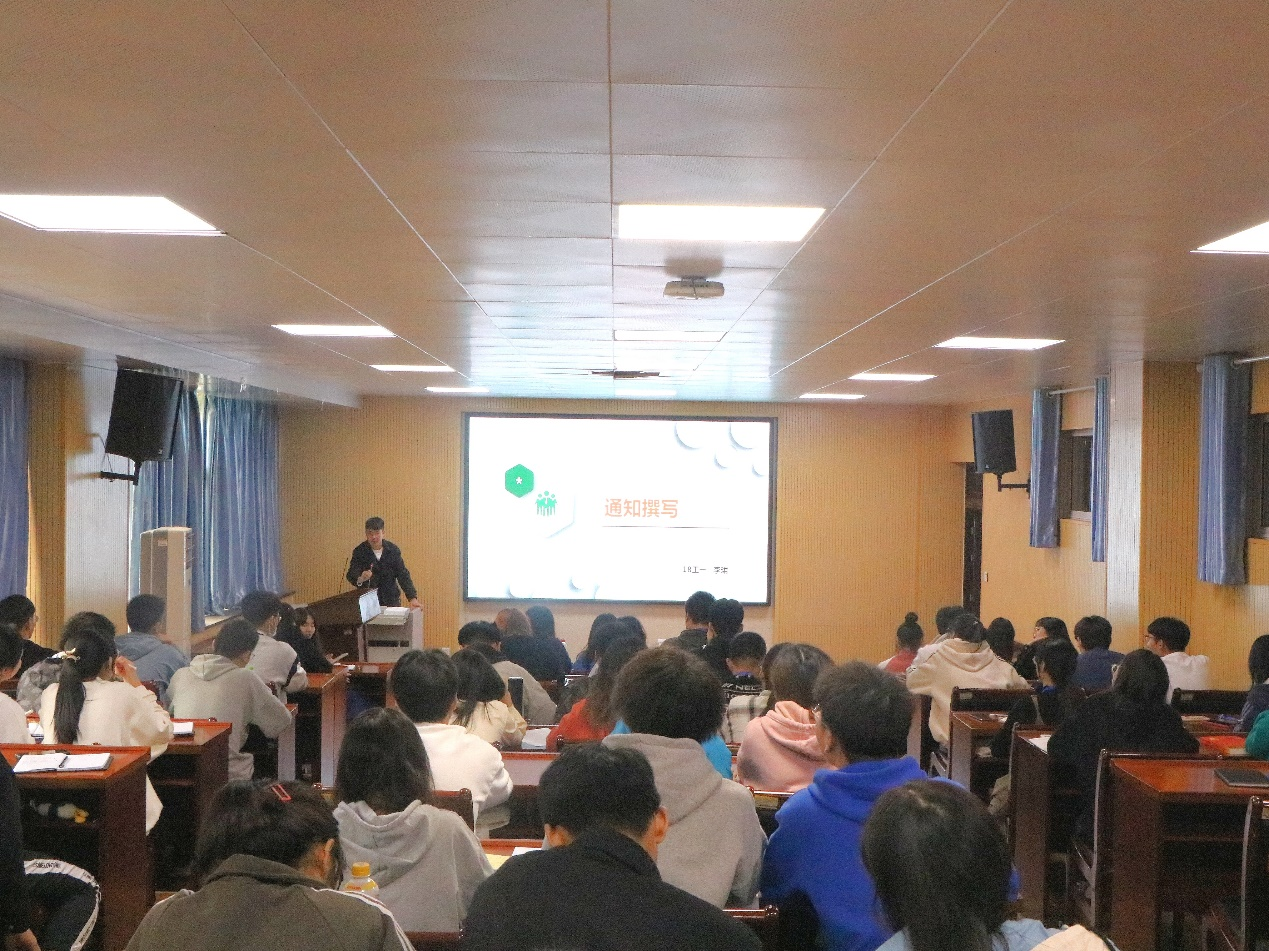 会议伊始,闫冬老师对新闻写作进行培训,她从什么是新闻、新闻的写作原则,消息的结构展开叙述,向大家介绍新闻相关内容,随后向同学们介绍标题的形式、各类新闻的撰写思路及撰写时的注意事项,并且讲述校园新闻稿图片要求及拍照时容易出现的问题。接着,李珺同学从发布时间,内容形式,向大家讲解了如何撰写通知,并提出撰写通知时出现的问题及注意事项,尤其在发布时间方面,做到合理安排发布时间,争取在有效时间段内每位同学都收到通知。随后,宋初臣同学向大家讲解Word及Excel的使用,如页面和纸张,查找和替换,页眉和页脚等如何操作和编辑。