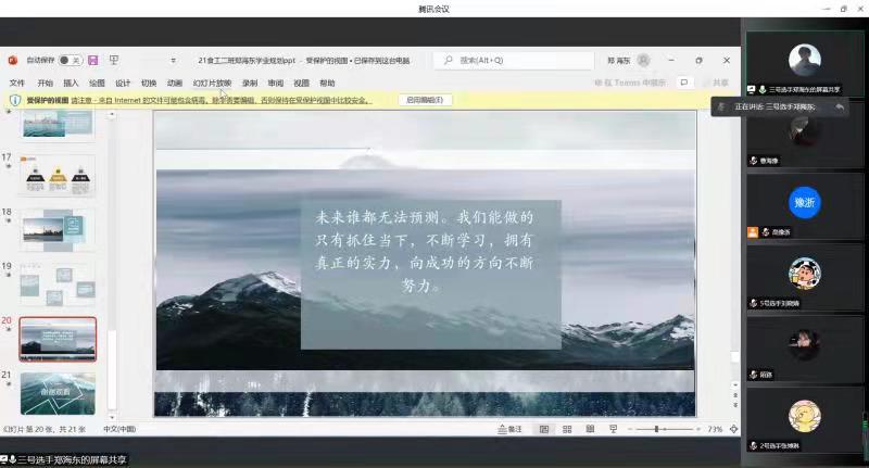 3月19日晚七点,我院成功举办第六届学业规划大赛院级初赛,本次比赛采取线上答辩评选的方式进行,出席本次比赛的评委有我院党委副书记曹玉松、21级辅导员韩彦航、21级部分班导师和第五届校级学业规划大赛三等奖获得者张山桥,比赛共有十三位选手参加。