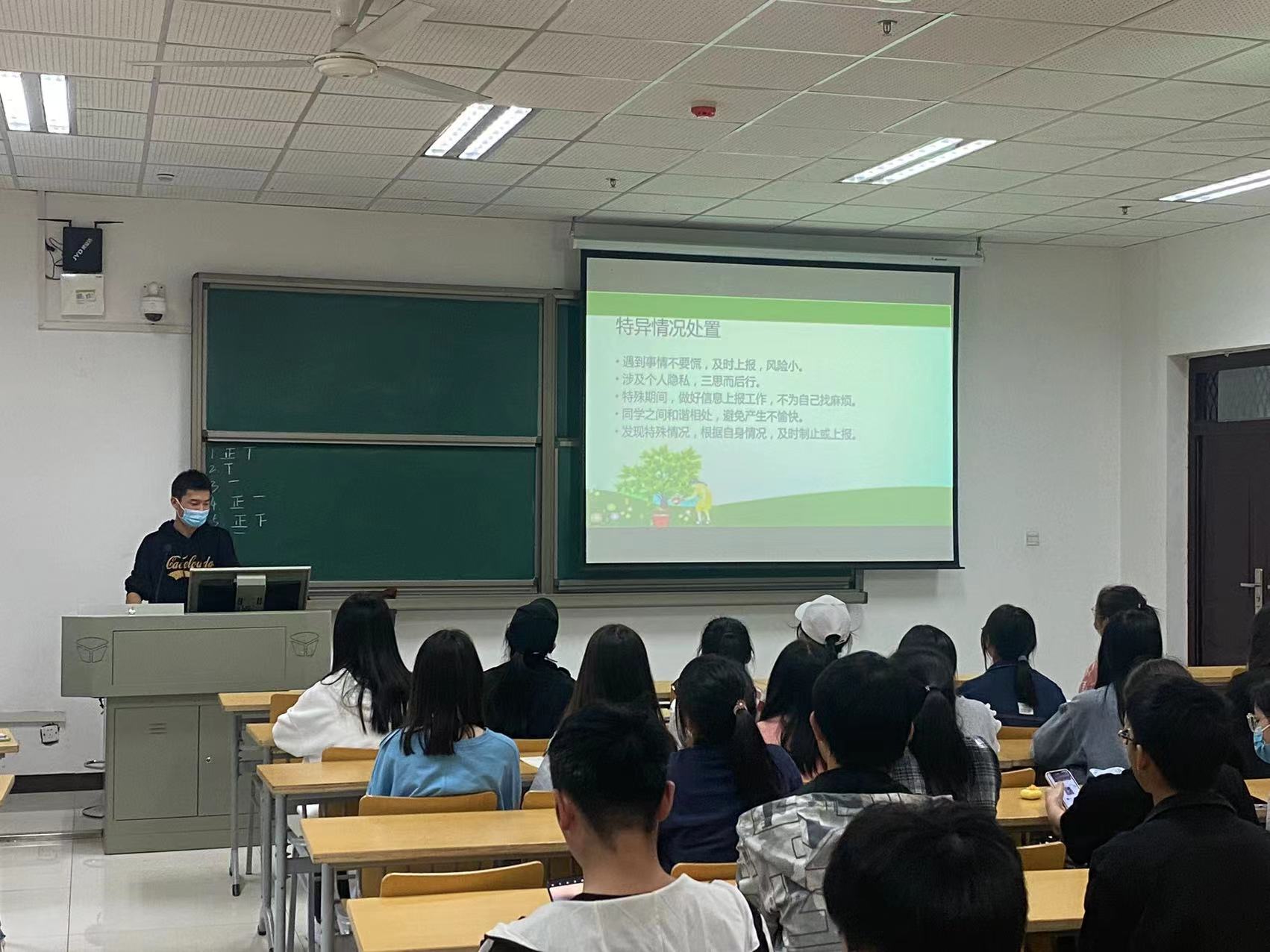 本次活动主要分为三个部分:心里健康教育、安全防范教育、防疫知识和校园安全知识教育。首先各班生活委员为同学们进行关于疫情防控的心理健康教育,引导同学们认识疫情防控、校园安全的长期性和复杂性,自觉培育积极、健康、向上的心理状态,树立战胜困难的决心和信心。为了引导青年大学生树牢安全意识,各班生活委员依托校园安全主题班会,教导同学们从防火防盗、防诈骗、防实验实习事故等基础事务做起,养成不违反实验安全操作规定、出门落锁、不轻信网络信息等良好习惯。最后各班生活委员向同学们传输防疫知识和校园安全知识,引导同学们养成日常正确佩戴口罩、文明就餐、保持宿舍整洁卫生、定期通风、安全用火用电等良好的生活习惯。